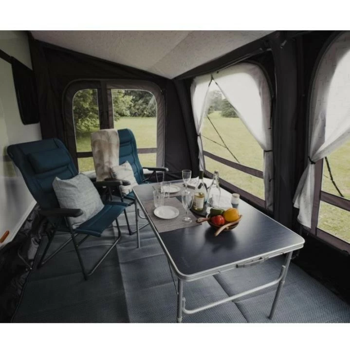 Das aufblasbare Vango Balletto Air 390 Elements ProShield Wohnwagen-Vorzelt kombiniert traditionelles Design mit neuester Technik. Die neue, revolutionäre AirBeam® S.I Pro – Single Point Inflation hat nur noch ein Ventil, an dem du das Zelt mit der mitgelieferten Doppel-Hub-Pumpe aufblasen musst. Damit geht der Aufbau noch schneller und dein Zelt steht in ca. 15 Minuten. Zum EntlĂĽften gibt es mehrere Ventile, was auch das EntlĂĽften und das Einpacken des Zeltes schneller von statten gehen lässt. Das extrem robuste, langlebige und witterungsbeständige 300D Elements ProShield-Gewebe ist ideal fĂĽr Reisemobilisten und verfĂĽgt ĂĽber den zusätzlichen Vorteil der ColourLok™-Technologie, die die Farbbeständigkeit unterstĂĽtzt.