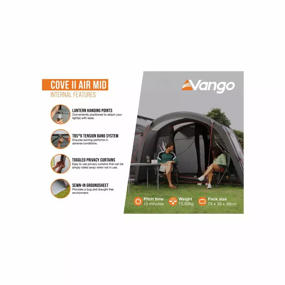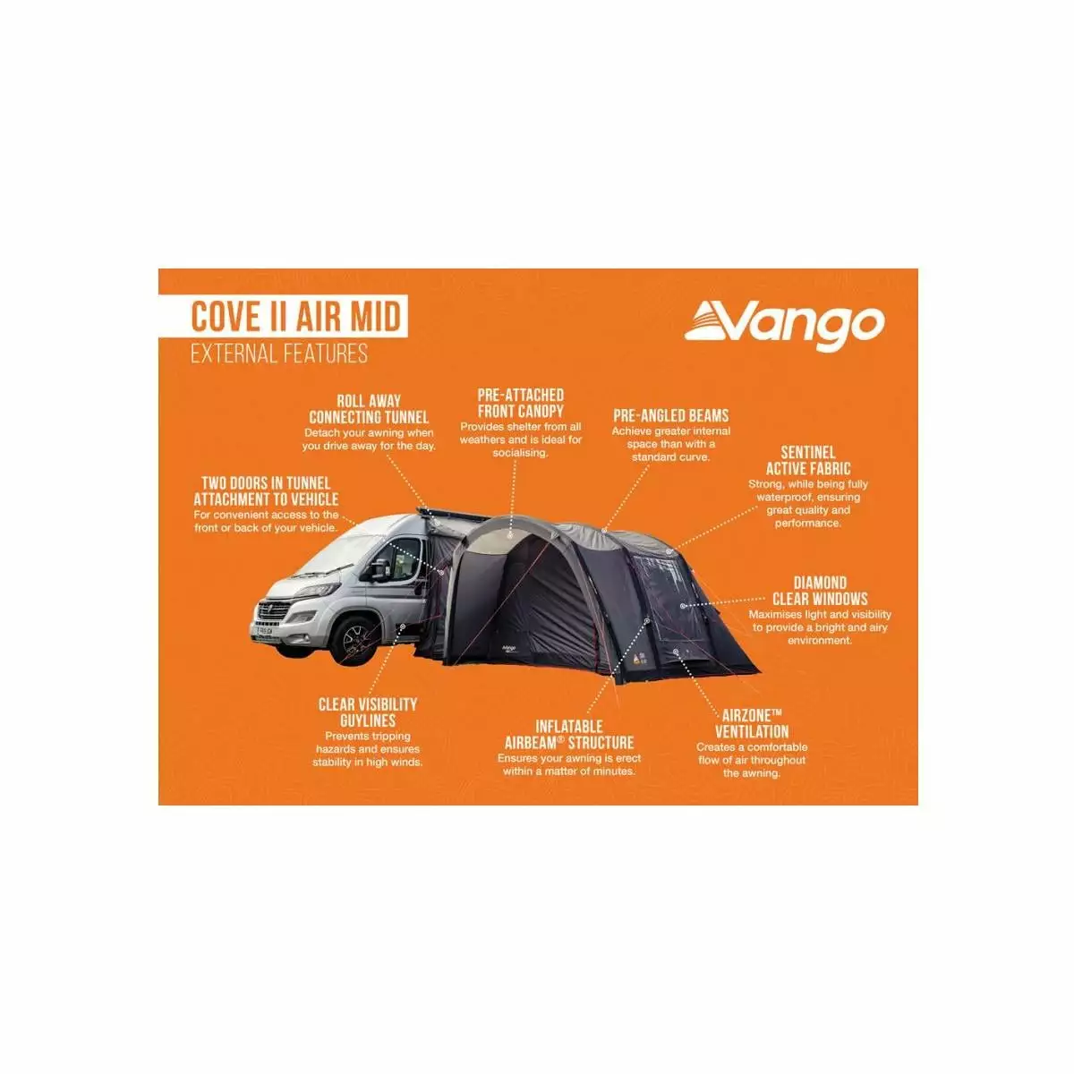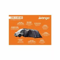 Das Vango Cove Vorzelt ist perfekt für Paare und junge Familien, die sich auf ein Abenteuer einlassen. Dieses aufblasbare Vorzelt ist in der gleichen Richtung wie Ihr Wohnmobil positioniert, so dass Sie immer den Blick auf die Aussicht gerichtet sind und zusätzliche Privatsphäre vor Ihren Campingnachbarn haben. Die eingenähte Bodenplane macht das Cove zum idealen Wohn- oder Stauraum, während die AirBeams® eine starke und steife Struktur bilden, die schnell und einfach aufgebaut werden kann. Die ideale Ergänzung zu Ihrem Wohnmobil für alle Ihre Ausflüge in die Natur.