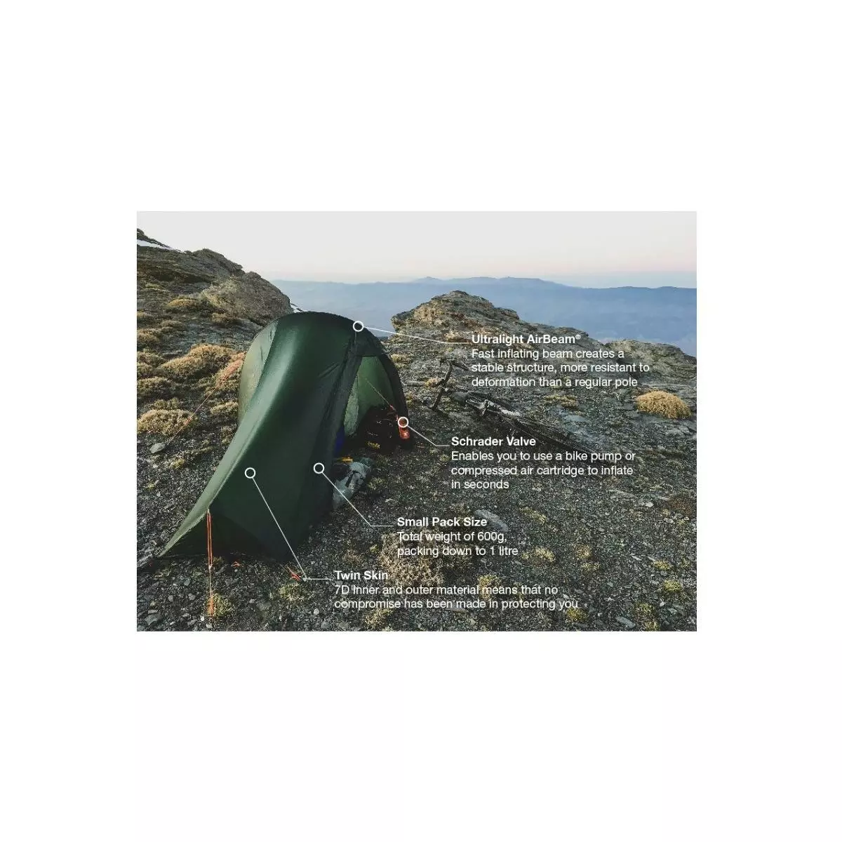 Das leichteste Doppelhautzelt der Welt mit Airbeam-Technologie, verbessert die Festigkeit und Stabilität und lässt sich schnell aufbauen. Die Struktur ist stark komprimierbar.