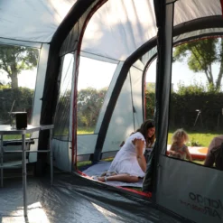 Um in dein Fahrzeug zu gelangen, ohne durch das Zelt laufen zu müssen, gibt es 2 Zugänge zur Schleuse, die das Zelt mit dem Fahrzeug verbindet. In den Wohnraum gelangst du durch eine Mesh-Tür. Die eingenähte Bodenplane hält aufsteigende Feuchtigkeit fern und gibt euch einen trockenen Wohnraum. Große Diamond-Clear Fenster sorgen für einen schönen Ausblick und für jede Menge Helligkeit im Vango Galli CC Air Low Busvorzelt. Wünschst du dir mehr Privatsphäre, kannst du die Vorhänge ganz unkompliziert verschließen.