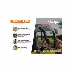 Das Vorzelt Galli Air Tall ist ideal für alle, die in ihrem Urlaub im Freien einen großen und vielseitigen Platz benötigen und eignet sich hervorragend für Familienurlaube. Das vormontierte Vordach bietet außerdem einen großartigen Platz zum Entspannen im Freien, egal wie das Wetter ist. Das aus Vango Sentinel Active-Gewebe gefertigte Zelt ist extrem leicht und ideal, wenn Platzersparnis wichtig ist. Die AirBeam-Struktur ermöglicht ein schnelles und einfaches Aufstellen mit einer starken und zuverlässigen Struktur. Das patentierte Tension Band System von Vango sorgt für zusätzliche Stabilität bei windigen Bedingungen. Mehrere Befestigungsmöglichkeiten für Fahrzeuge erleichtern den Aufbau, während der wegrollbare Tunnel es ermöglicht, das Galli freistehend zu lassen. Diese Markise ist für den Reisegebrauch konzipiert; sie ist nicht für den stationären oder langfristigen saisonalen Einsatz geeignet, da eine starke UV-Bestrahlung zu einem beschleunigten Abbau des Gewebes führt.