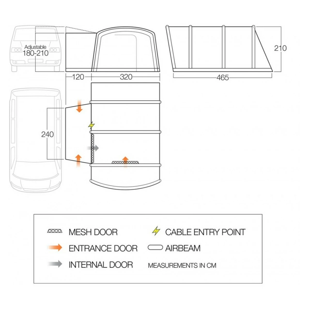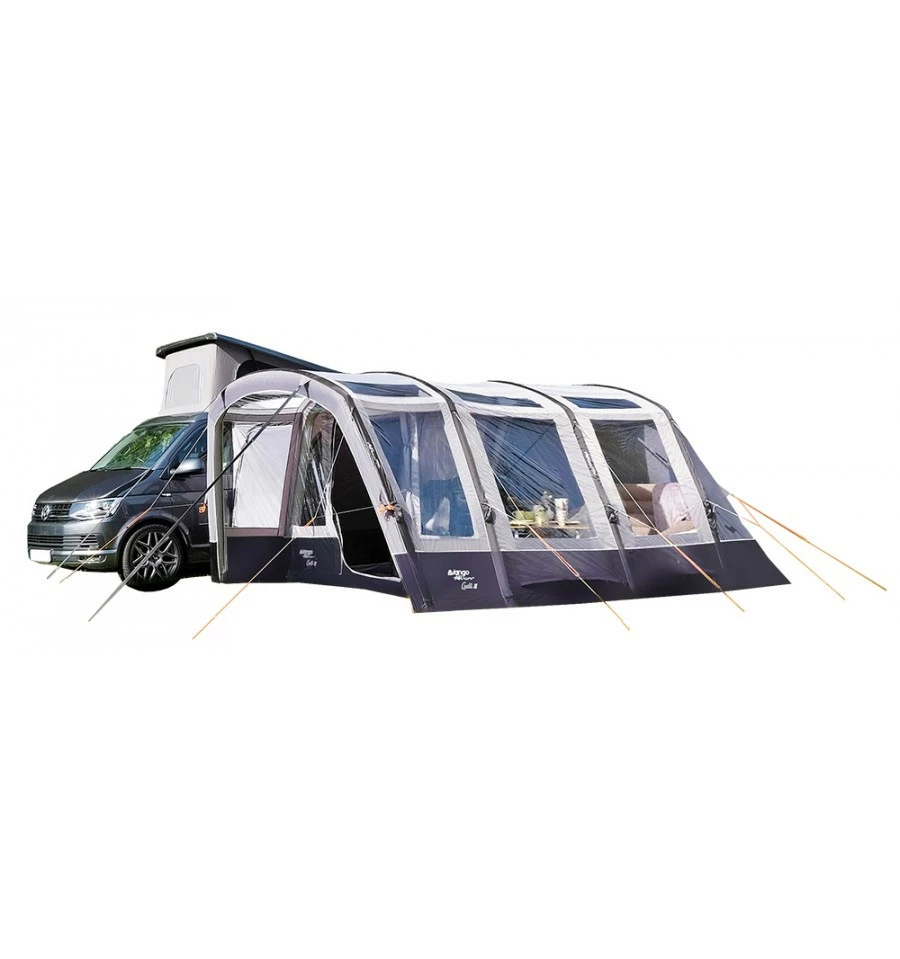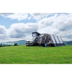 Das Vango Galli III Air Low Busvorzelt ist ein freistehendes Buszelt, was längs zum Fahrzeug steht. Durch die einzeln aufzupumpenden AirBeam Luftkanäle steht das Zelt in wenigen Sekunden. Das Sentinel Pro 420 Material ist ein Doppelripstop-Polyester, was sehr robust und reißfest ist, so dass die Lebensdauer des Galli III Air Low deutlich verlängert wird.