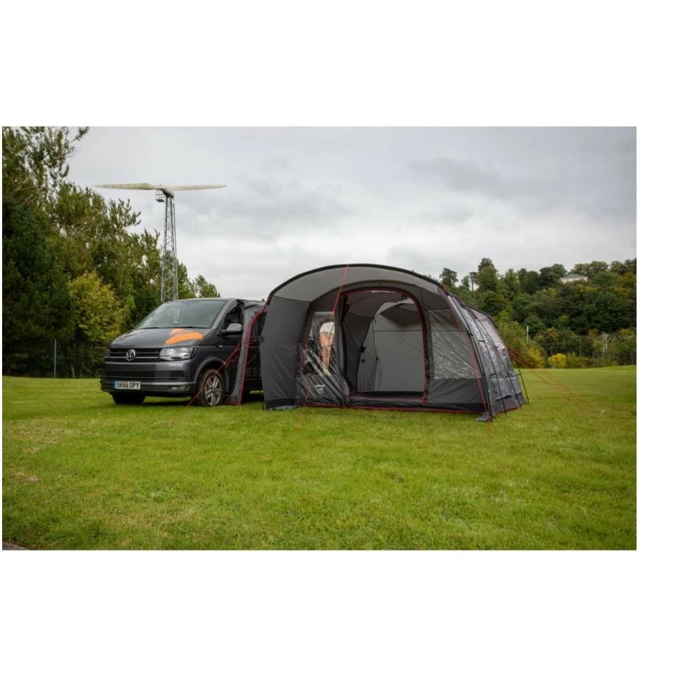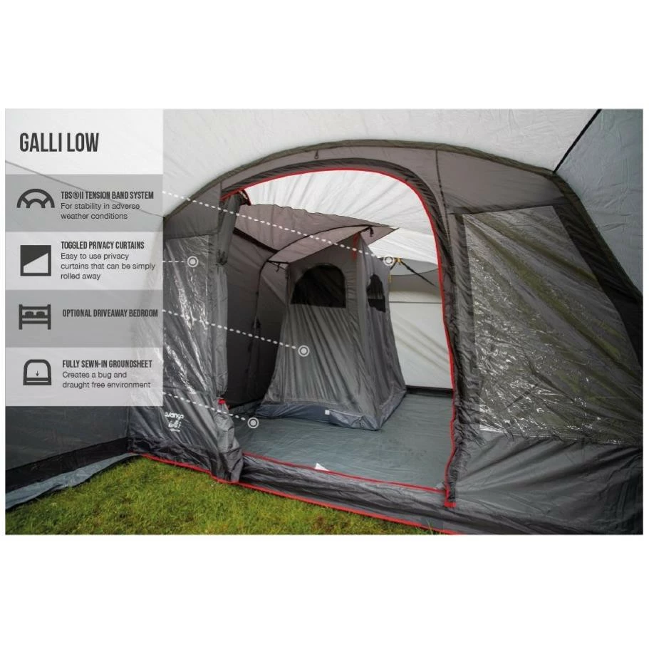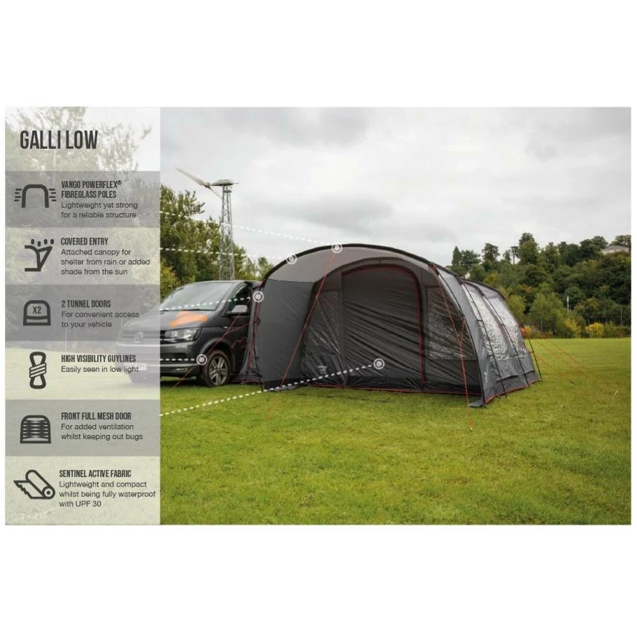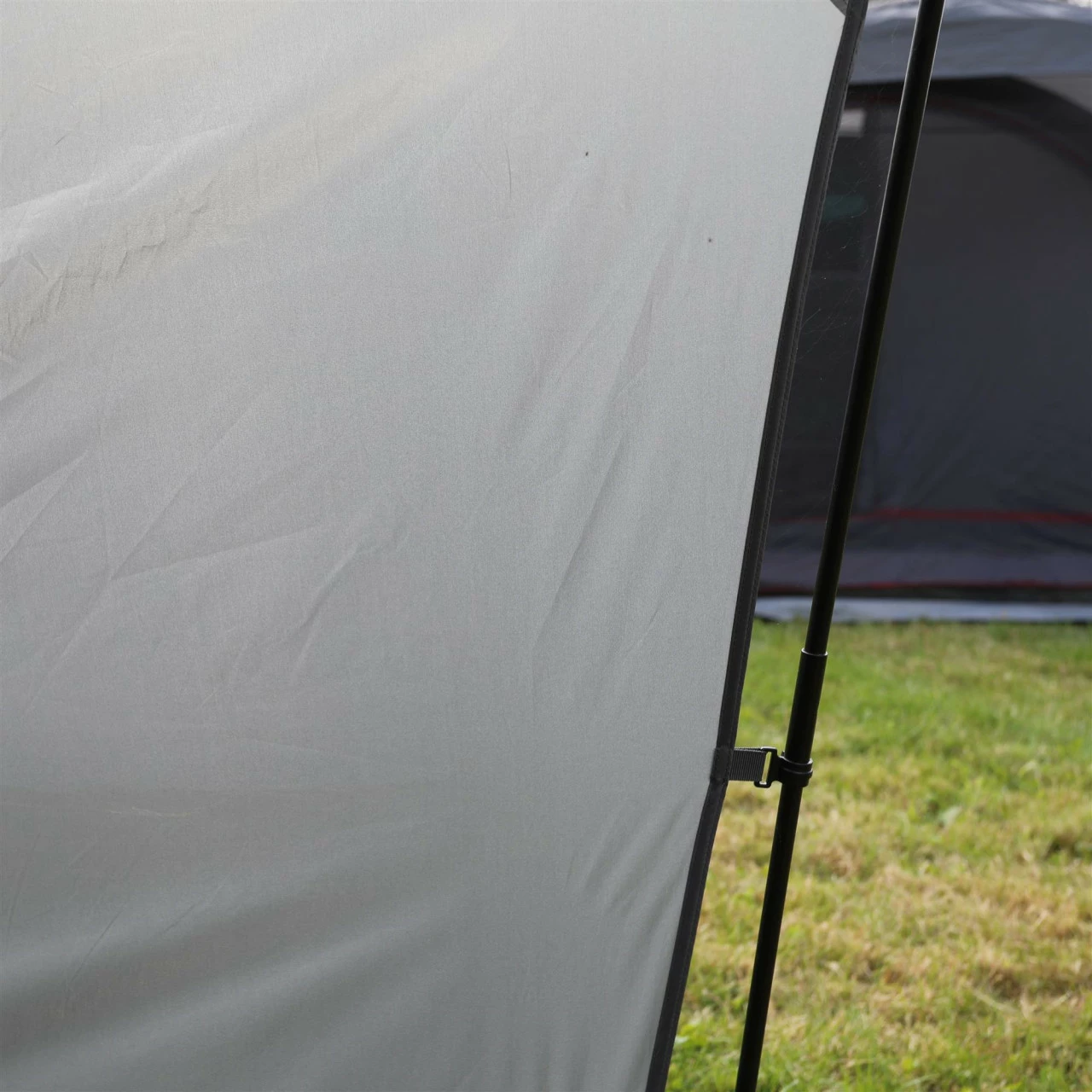 Das Vango Galli Low ist ein “Drive Away” Busvorzelt. Das bedeutet, du kannst das Zelt stehen lassen, wenn du mit deinem Bus einen Tagesausflug machst. DafĂĽr rollst du einfach die Verbindungsschleuse zurĂĽck. Das Vango Galli Low bietet mehrere Befestigungsmöglichkeiten an den Bus: es gibt eine vormontierte 6 mm Kederschiene, Gurte, Regenrinne und Reling. Es gibt 2 separate Eingänge zur Verbindungsschleuse. Der Hauptzugang zum Vango Galli Low ist durch ein groĂźes Vordach vor Wind und Wetter geschĂĽtzt. Die EingangstĂĽr ist komplett mit Moskitonetz versehen, so dass du sie zur optimalen BelĂĽftung offen lassen kannst. Die groĂźen “Diamond Clear PVC-Fenster” lassen sich durch Vorhänge verschlieĂźen, wenn du deine Privatsphäre haben möchtest. Mit dem leichten PowerFlex Fiberglas Stangen steht dein Busvorzelt stabil und ist trotzdem nicht zu schwer.