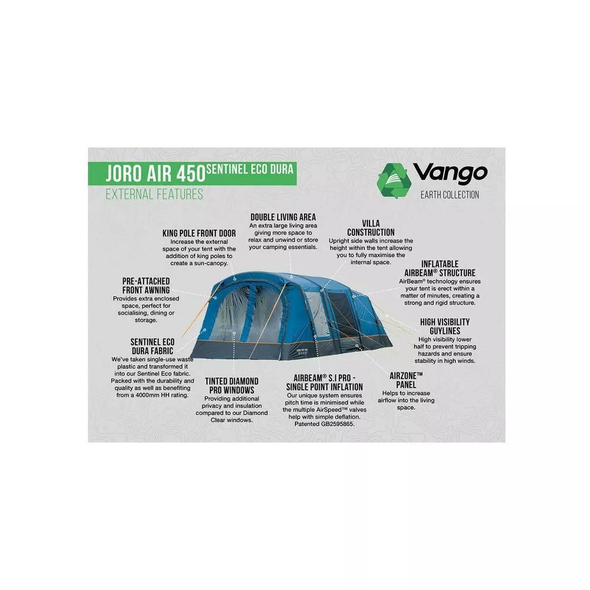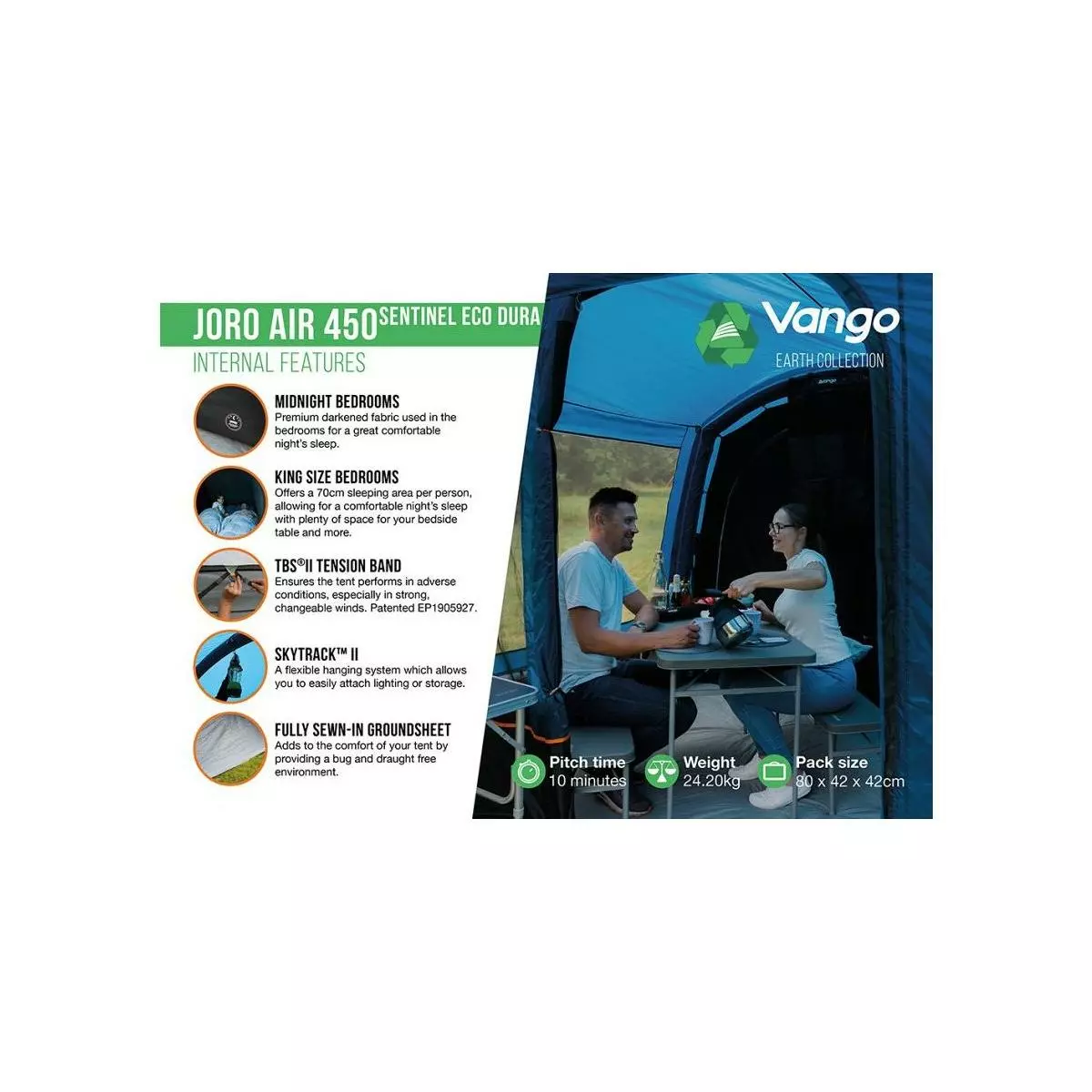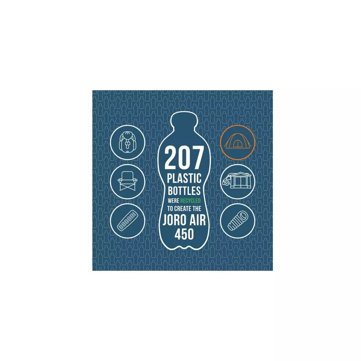 Das neue Joro Air 450 ist das perfekte Familienzelt für all jene, die die Natur lieben. Als Teil unserer Earth-Kollektion profitiert das Joro von unserem Sentinel Eco Dura-Gewebe, das aus recyceltem Einwegplastik hergestellt wurde und 4.000 mmHH bietet. In Kombination mit Schlüsselmerkmalen einschließlich vormontiertem Vorzelt, einem überdachten Seiteneingang und einem großen Wohnbereich entsteht ein geräumiges Zelt zum Entspannen. Ausgestattet mit unserem revolutionären AirBeam S.I Pro® Einpunkt-Aufblas-System, was das Aufstellen noch einfacher gestaltet. Eine hervorragende Wahl für Familien oder Gruppen, die nach einem gut durchdachten und vielseitigen Zuhause auf dem Campingplatz suchen.