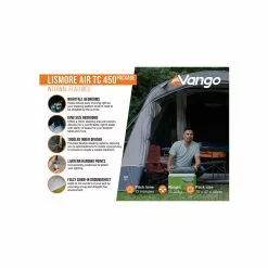 Das Lismore Air TC 450 ist perfekt für lange Sommerurlaube mit zusätzlichem Luxus. Er wurde mit unserer AirBeam®-Technologie entwickelt, die ein schnelles Aufblasen und eine robuste und zuverlässige Struktur gewährleistet. Das Lismore profitiert von unserem Sentinel TC-Gewebe, das die führenden Eigenschaften von Baumwolle und Polyester zu einem reichhaltigen Polycotton-Gewebe kombiniert, das atmungsaktiv und klimaregulierend ist. Im Paket enthalten ist ein zusätzlicher Zeltbodenschutz, der den Zeltboden und das Zelt schützt und seine Lebensdauer verlängert.
