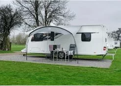 Die Überdachung Sun ist so konzipiert, dass sie neben dem Wohnwagen, Reisemobil oder Wohnmobil einen geschützten überdachten Außenbereich bietet. Sie kann einfach mit dem vormontierten Kador-Streifen befestigt werden und sorgt so für einen sauberen Sitz an der Seite Ihres Fahrzeugs.