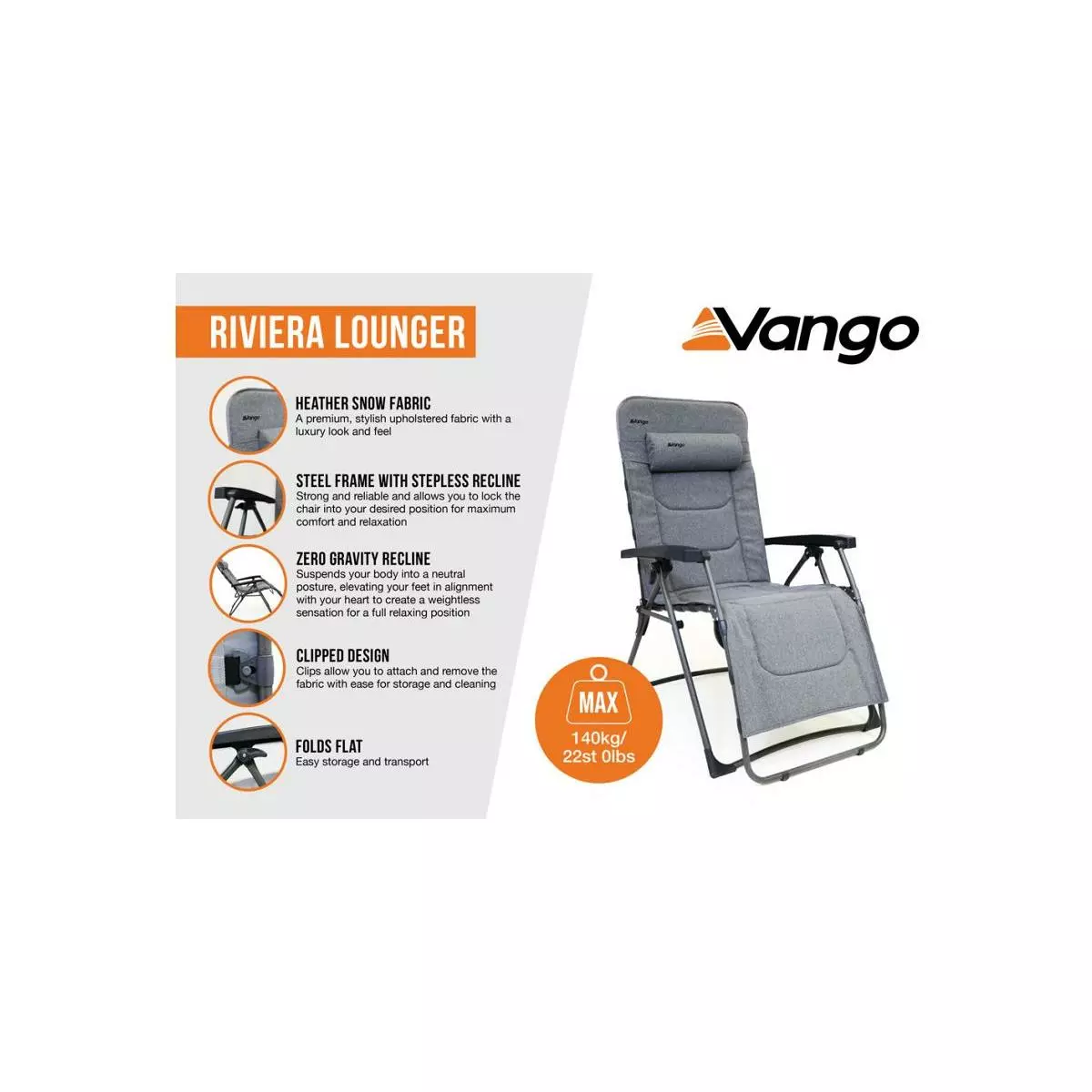 Der Vango Riviera Liegestuhl ist ein Muss fĂĽr die Entspannung im Garten oder im Urlaub, sei es beim Camping, im Wohnmobil oder im Wohnwagen, damit sich richtig entspannen lässt. Mit einer Rundum-Polsterung bietet dieser Stil ein erstaunliches MaĂź an Komfort und Funktionalität. Der prächtige Heather Snow-Stoff ist nicht nur stilvoll, sondern auch superweich. Das abnehmbare Kopfkissen kann auch als LendenwirbelstĂĽtze verwendet werden, und die stufenlose Neigungsverstellung sorgt dafĂĽr, dass man die ultimative Entspannungsposition findet. Die spezielle Zero Gravity”-Spezifikation sorgt dafĂĽr, dass der Körper in seiner natĂĽrlichen Haltung in einer Linie mit dem Herzen schwebt, um ein GefĂĽhl der Schwerelosigkeit zu erzeugen, und bietet die Möglichkeit, den Sessel in der gewĂĽnschten Position zu fixieren.