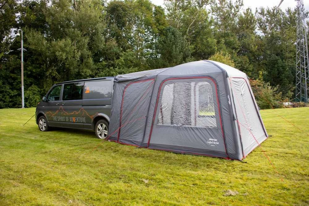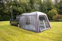Das Vango Tailgate AirHub Low Busvorzelt ist das erste Vangobusvorzelt, welches auch am Heck Deines Fahrzeuges angebracht werden kann und ist somit ideal fĂĽr Deinen Campingurlaub. Es besteht aus einem Sentine Active Gewebe und ist dadurch absolut wasserdicht. Es eignet sich ideal fĂĽr Busse die eine Anschlusshöhe von 180 – 210 cm haben. Die Heckklappe wird komplett durch die Schleuse abgedeckt und bietet zudem zwei seitliche EingangstĂĽren. Du kannst das Vorzelt auch seitlich am Fahrzeug montieren. Möchtest Du an einem Tag wegfahren, aber Dein Vorzelt am gewĂĽnschten Platz stehen lassen, kannst Du einfach den Tunnelbereich zwischen Zelt und Wagen zurĂĽckrollen. Ins Innere des Tailgate AirHub Low gelangst Du ĂĽber drei TĂĽren. Die HaupteingangstĂĽr hat einen Mesh Einsatz. Dieser erhöht die Luftzirkulation und Du kannst die TĂĽr geöffnet lassen, ohne dass Insekten ins Zelt gelangen. Die groĂźen Fenster des Zeltes sorgen somit fĂĽr ausreichend Helligkeit im Wohnbereich und einen hervorragenden Blick auf Deine Umgebung. Durch die herausnehmbare Bodenplane kann der Zelteingang auf Bodenhöhe heruntergelassen werden und Du musst nicht mehr ĂĽber den Eingang gehen. So kannst Du leichter deine Fahrräder, Surfbretter oder Ă„hnliches verstauen.