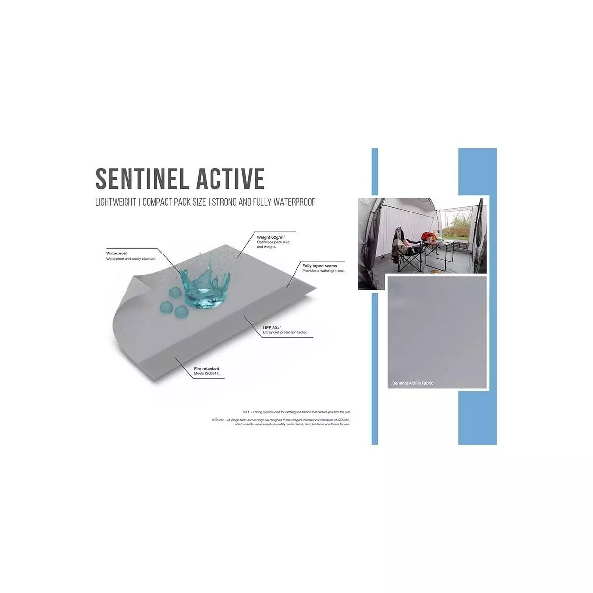 - Sentinel Active Gewebe – Wenn PackmaĂź und Gewicht die wichtigsten Einflussfaktoren bei der Wahl Ihres Vorzelts sind, wird speziell entwickeltes Sentinel Active Gewebe Ihre Anforderungen ĂĽbertreffen. Sentinel Active ist stark und gleichzeitig vollkommen wasserdicht, was eine hohe Qualität und Leistung bei kompaktem PackmaĂź gewährleistet.